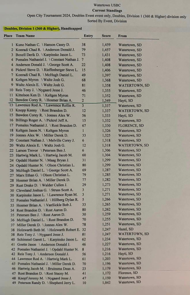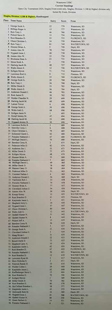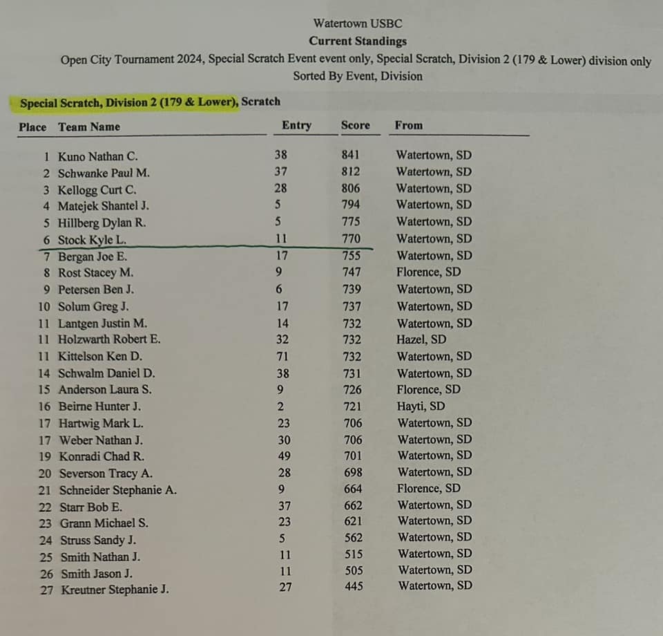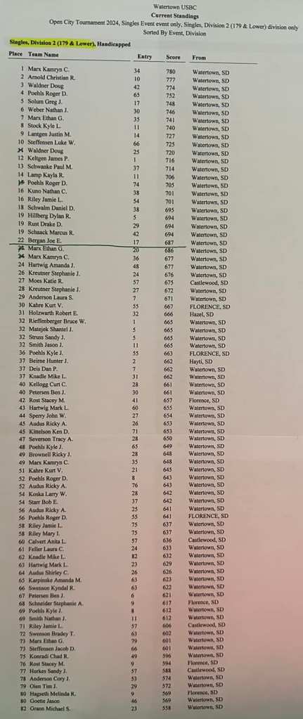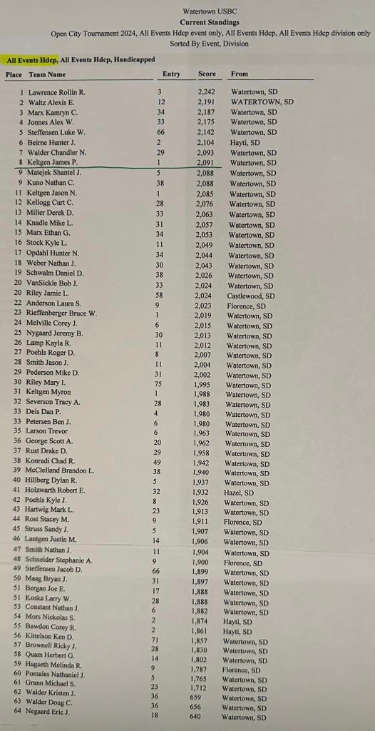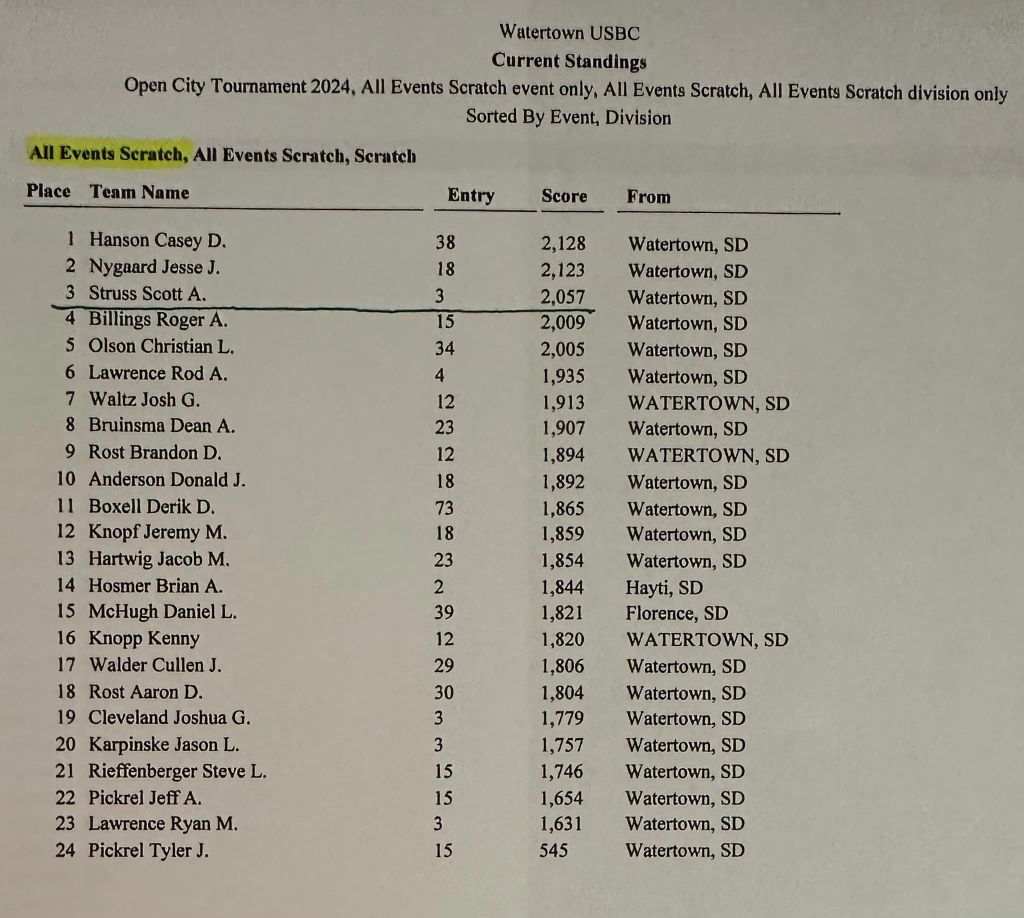 Today (2/25/24) was our last day of our Watertown USBC Open City Tournament. Thank you to all that bowled, came out to watch, help with brackets, raffles and other things during the tournament. We have a great bowling community and center to call our home. Here are the unofficial standings, final will be posted later.