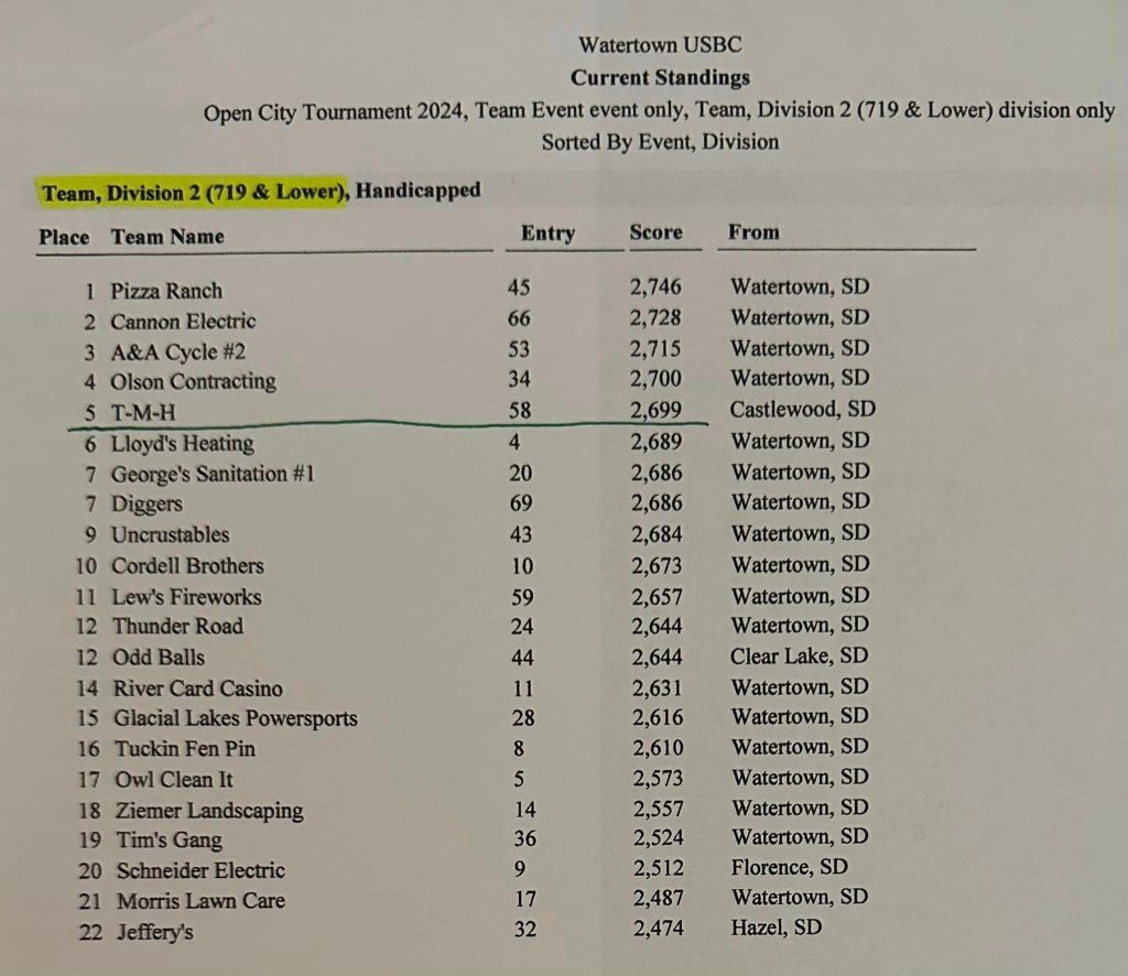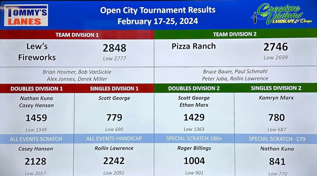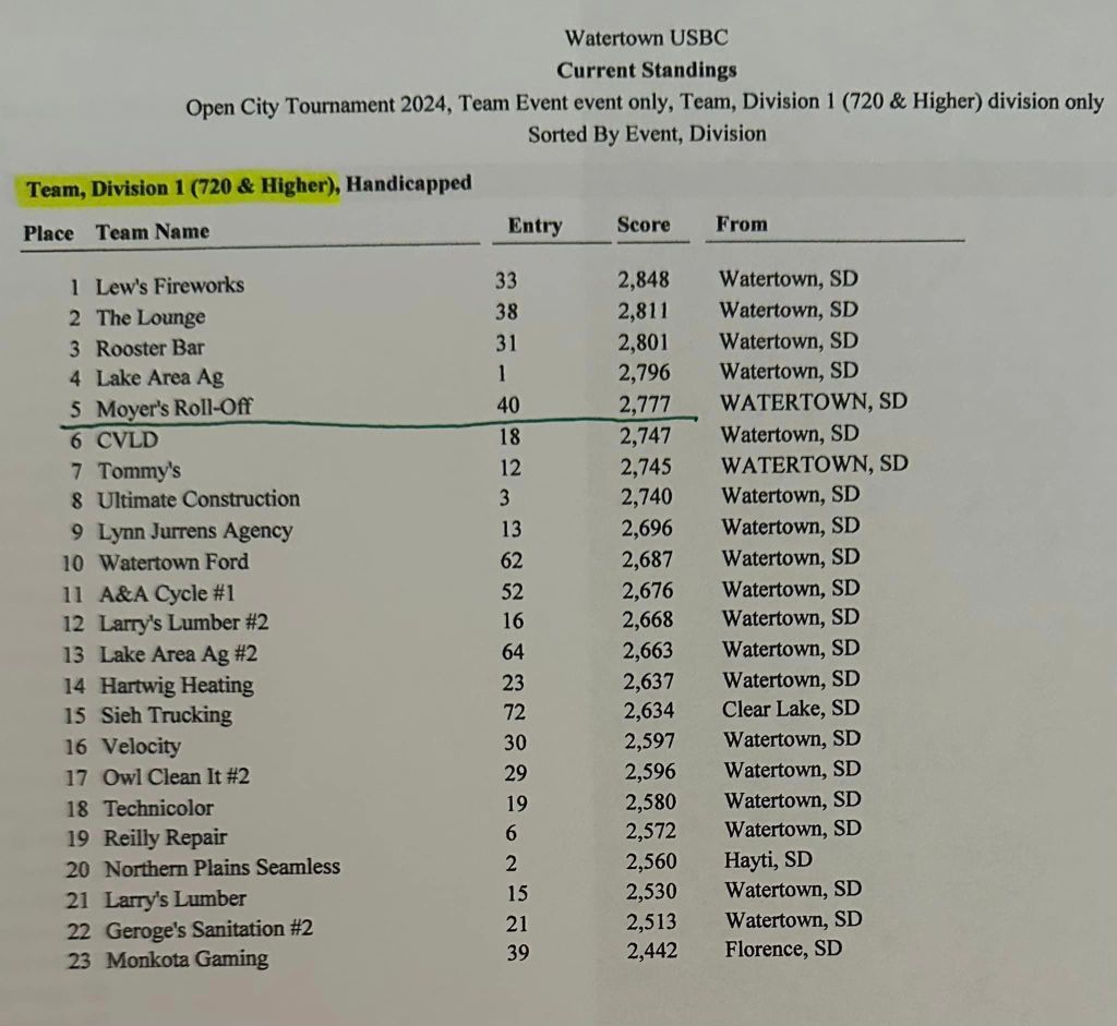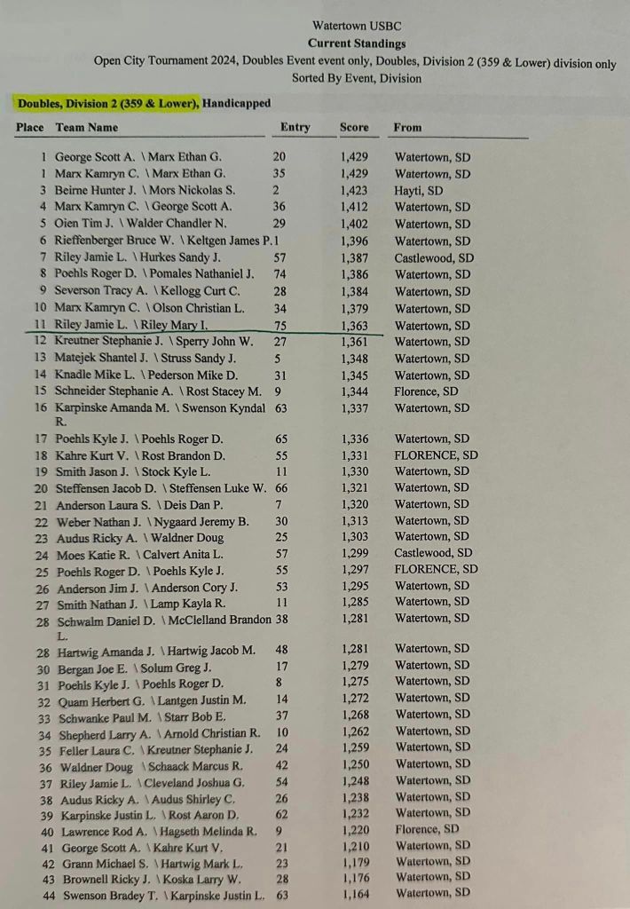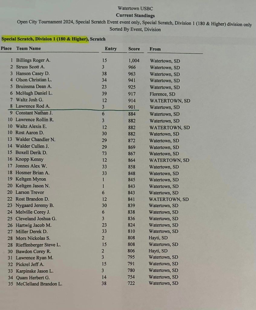 Today (2/25/24) was our last day of our Watertown USBC Open City Tournament. Thank you to all that bowled, came out to watch, help with brackets, raffles and other things during the tournament. We have a great bowling community and center to call our home. Here are the unofficial standings, final will be posted later.