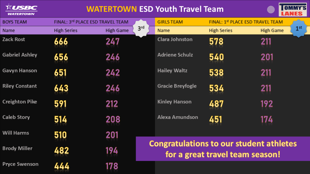 The Watertown Boys ESD Travel team placed 3rd overall, with Madison boys taking first place and Pierre taking 2nd. Zack Rost had a high game of 247 and a high series of 666 for the Watertown Boys. Team members include: Zack Rost, Gabriel Ashley, Gavyn Hanson, Riley Constant, Creighton Pike, Caleb Story, Will Harms, Brody Miller and Pryce Swenson.