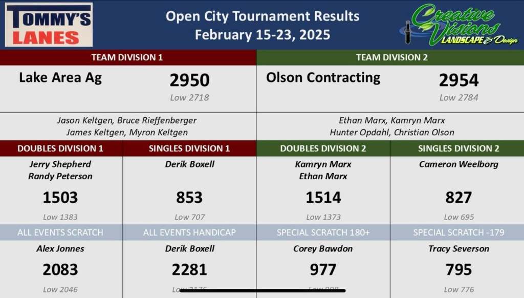 Today (2/23/25) was our last day of our Watertown USBC Open City Tournament. Thank you to all that bowled, came out to watch, help with brackets, raffles and other things during the tournament. We have a great bowling community and center to call our home. Here are the unofficial standings, final will be posted later.