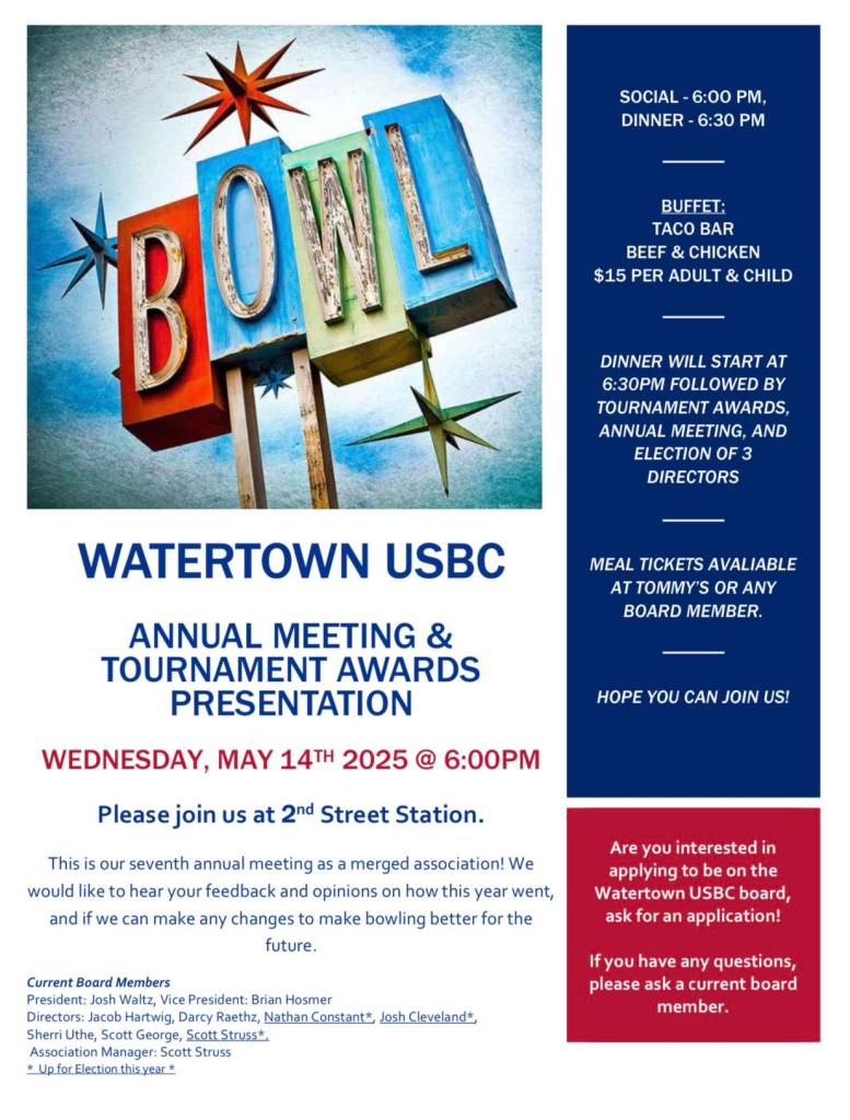 You are cordially invited to our Awards Banquet and annual meeting on May 14th at 2nd Street Station. Meal tickets are available for purchase at Tommy’s Lanes. We look forward to seeing you there!