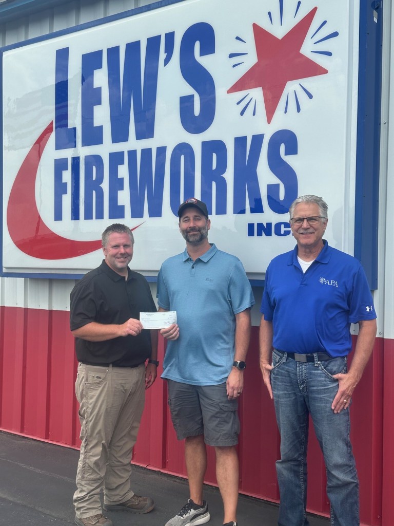On August 7th, 2025, Dan and Derek from Lew’s Fireworks were honored to present proceeds of $4388.05 from the 2025 sales of “Kingpin” to Watertown SD Youth Bowling to support youth bowling program. Lew’s Fireworks, Inc. will be able to continue that support with future sales in the 2026 season.