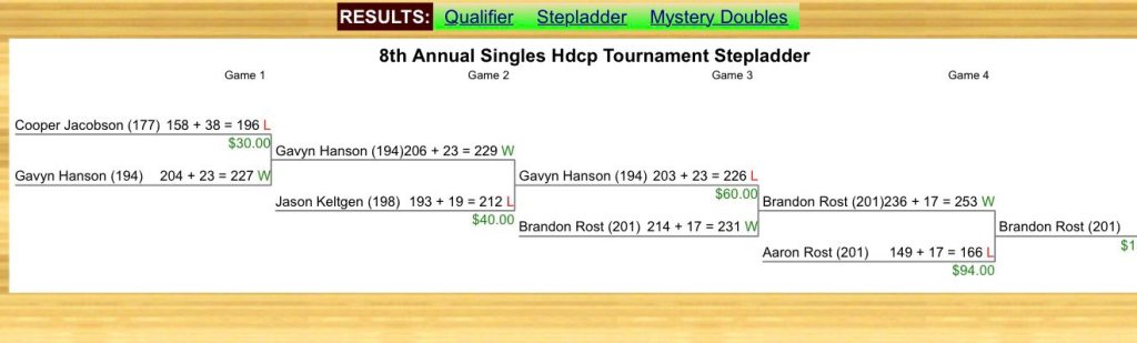 Gavyn was on the move in the stepladder, but Brandon took over and won the last two games to win the tournament. Congratulations Brandon Rost!