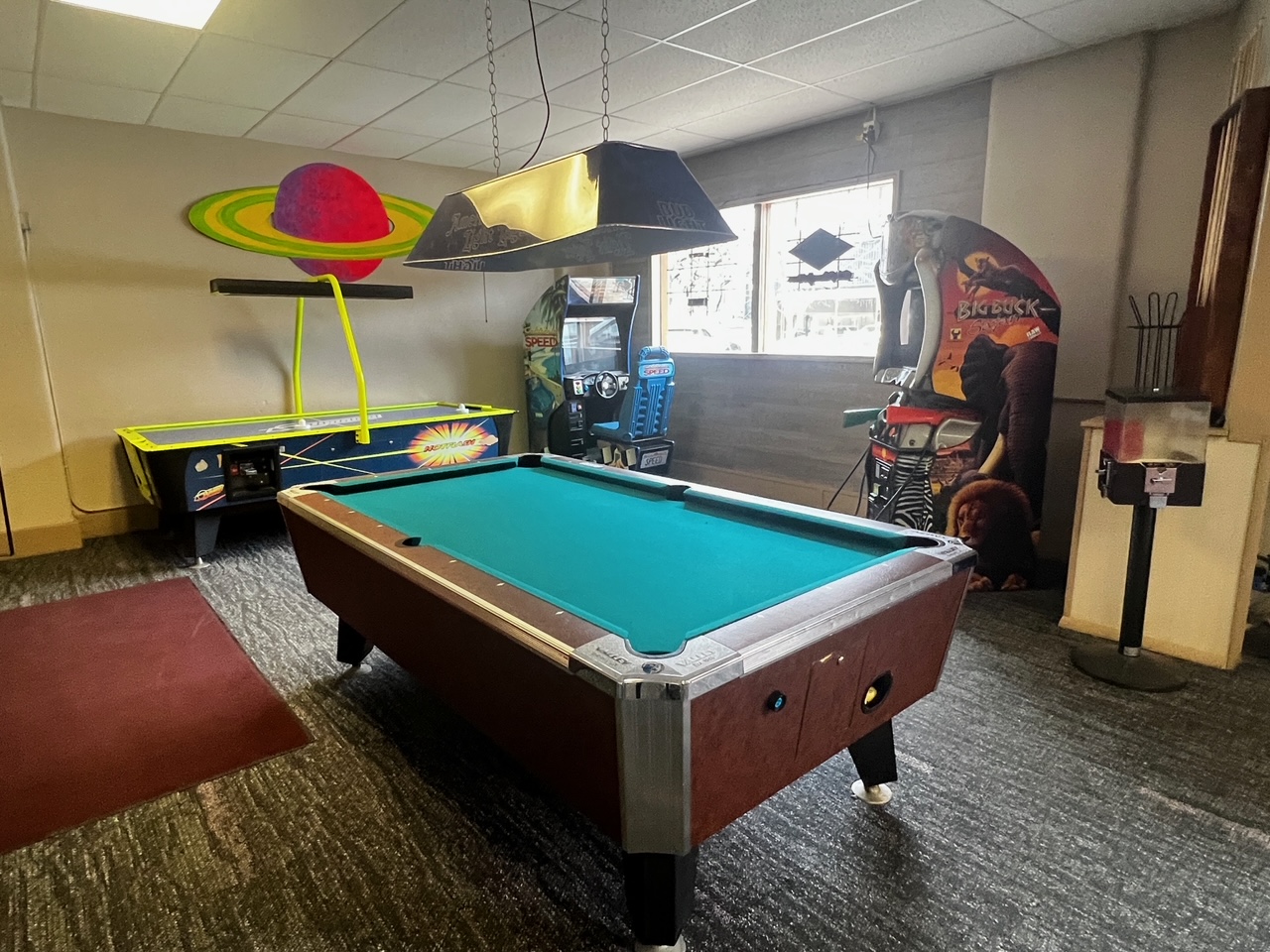 Full bar, pizza and snack bar, vending machines, pool table, air hockey, arcade and video lottery machines available.